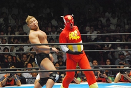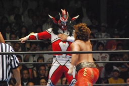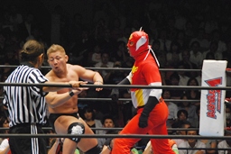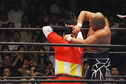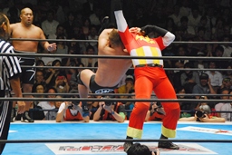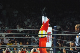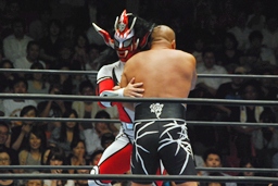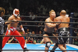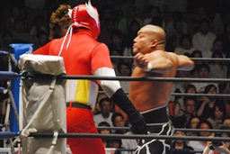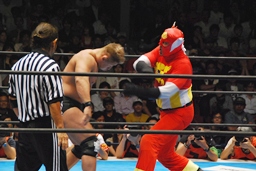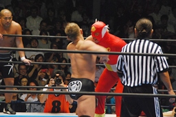 YOSHI-HASHIロープに振る、ライガー切り返してケブラドーラ・コン・ヒーロ(右写真)、YOSHI-HASHI場外に。ライガースライディングキック、タイガーにタッチ。
