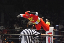 ライガーYOSHI-HASHIを場外に落としエプロンからトペ・コン・ヒーロ(右写真)。