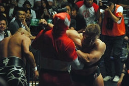 カリビアンデスグリップはかわされるが地獄突き(右写真)