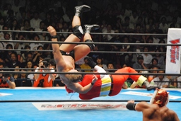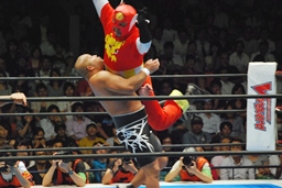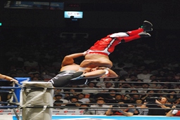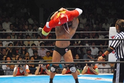 キャプテンボディスラムからコーナーに上ってダイビングヘッドバット(右写真)、YOSHI-HASHIかわす。全員場外に。