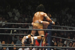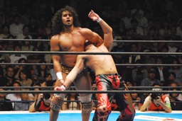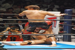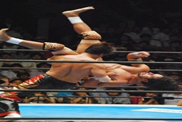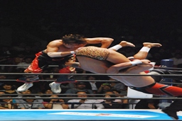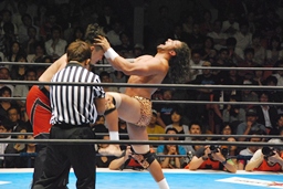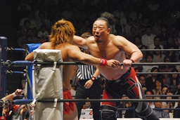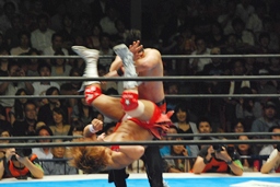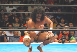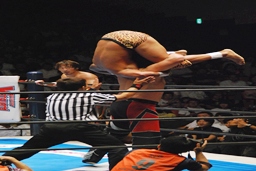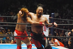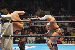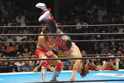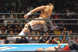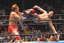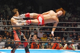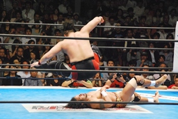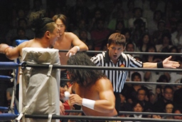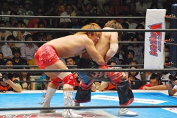 内藤足をすくってレッグロック(右写真)、丸藤は十字に切り返す、内藤ブロック。丸藤はキーロックにスイッチ、内藤エビ固めに押さえ込んでブレーク、バック取る、コーナーに押し込んでタマにタッチ。