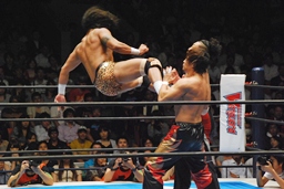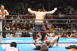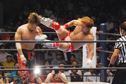 丸藤がタイガーフロウジョンの体勢、タマブロック、丸藤ニーリフト浴びせタイガーフロウジョン(左写真)、カウント3。