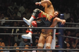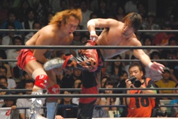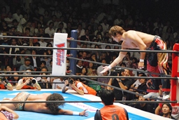 丸藤がコーナーから飛んで新生マッスルドッキング(右写真)、内藤カット。ヨネが内藤を場外に出す。