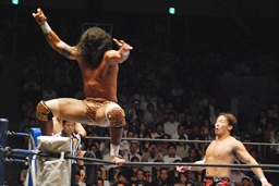 内藤ヒップトスからドロップキック、ロープに飛んでサマーソルトドロップ(右写真)、カウント2。