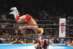 タマロープに飛ぶ、ヨネカウンターのビッグブーツ、ボディスラムからギロチンドロップ(右写真)。