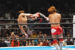 タマが再度丸藤ヘッドシュリンカー狙うが丸藤ブロックしてトラースキック(右写真)。