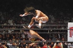 ヨネロープに飛ぶ、内藤フライングエルボー(右写真)、両軍タッチ。