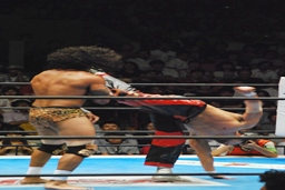 内藤はトラースキックをかわして延髄蹴り(左写真)、