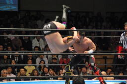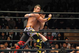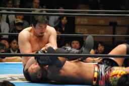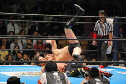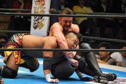 デヴィットカニばさみで倒し足を取る(右写真)。ヘッドロックからフライングメイヤー、KUSHIDAヘッドシザーズでブレーク。両軍タッチ。