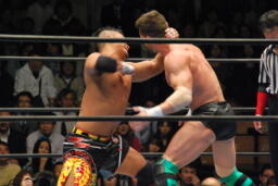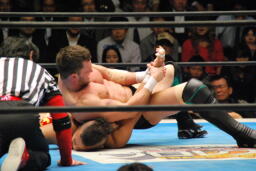 デヴィットKUSHIDAの腕を極める(左写真)。