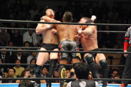 KUSHIDA入ってダブルの打撃攻撃(左写真)。