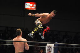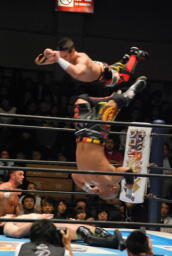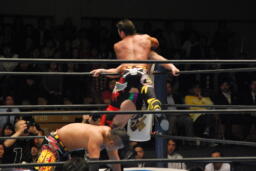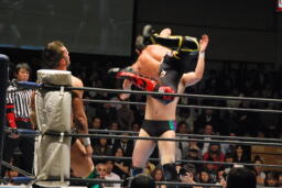 コーナーに上ってダイビングクロスボディ(左写真)、