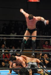 デヴィット低空ドロップキックから顔面ドロップキック(左写真)、カウント2。