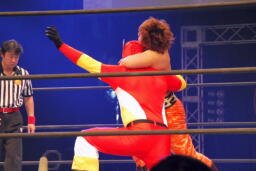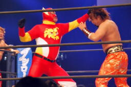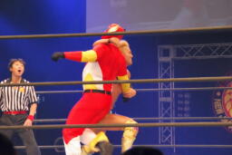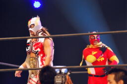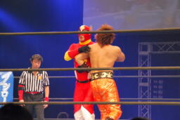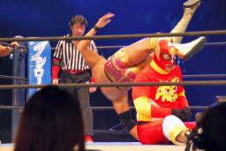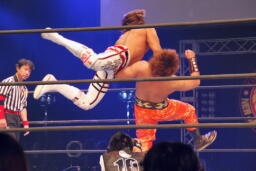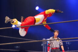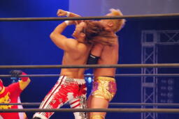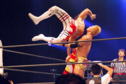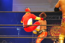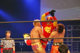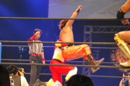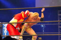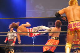 キャプテンコーナーに振って突っ込む、YOSHI-HASHIカウンターのキック。YOSHI-HASHI逆に突っ込む、キャプテンはカウンターのドロップキック狙うがYOSHI-HASHIが速過ぎてダブルニーアタックに(右写真)。両軍タッチ。