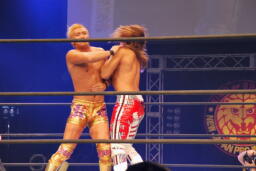 ロックアップ、オカダがロープに押し込む、ブレーク。再度ロックアップ、棚橋ヘッドロック、オカダがロープに振ってショルダーブロック打ち合い(左写真)。