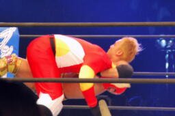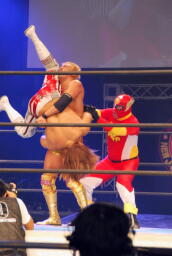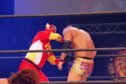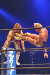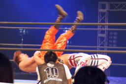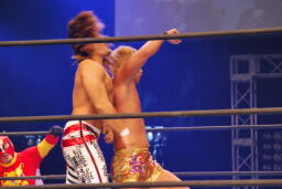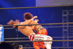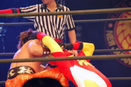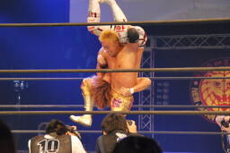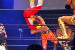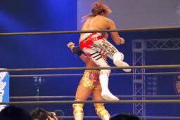 キャプテンがタッチ要求、棚橋無視して再度フルネルソン、YOSHI-HASHIブレーク、棚橋はだるまジャーマンに(右写真)、カウント2。