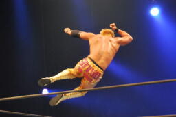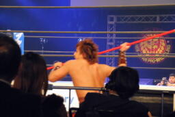 コーナーに振って串刺しエルボー、ヒラボトム(右写真)。コーナーに上るがオカダ立ち上がってパンチ、デッドリードライブ。