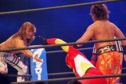 オカダがキャプテンを場外に出すとYOSHI-HASHIが如意棒で襲いかかる。凶器として使ってるのは初めて見た(左写真)。YOSHI-HASHIがキャプテンをリングに戻すとコーナーに押し込んでYOSHI-HASHIにタッチ。