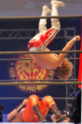 棚橋ボディスラム、コーナーに上る、オカダ下からドロップキック。凄い高さ(左写真)。