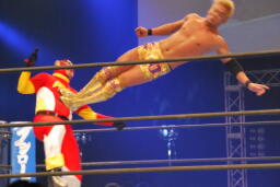 キャプテンパンチ(左写真)、ロープに振ってフライングショルダーブロック。