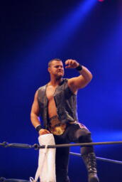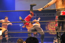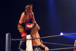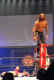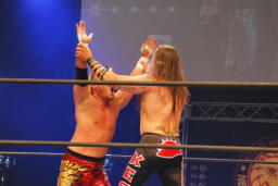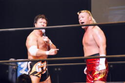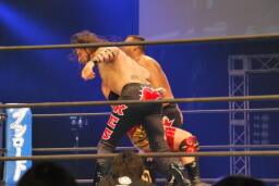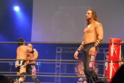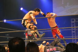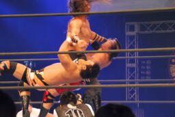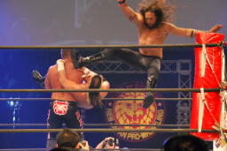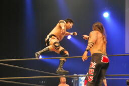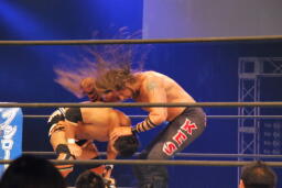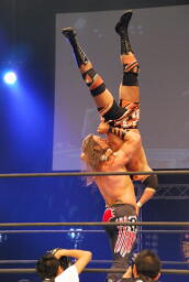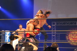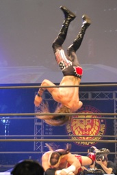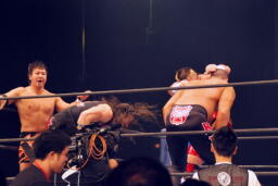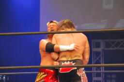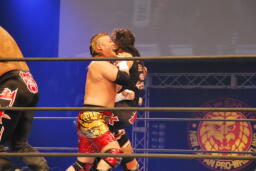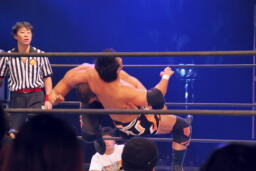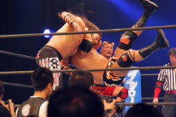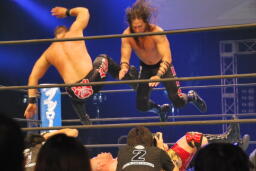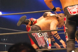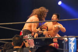 アーチャー串刺しラリアット、スミスベリートゥベリー(右写真)、カバーは小島がカット。スミスはアーチャーにタッチ。アーチャーコーナーに振って突っ込む、天山カウンターのキック。5分経過。