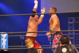 天山「オッケー! よっしゃ! 1勝やぞ、これで。まず1勝! この1勝おっきいぞ、オイ!このタッグリーグ、こっから一気に行くぞ、コジ! な?」