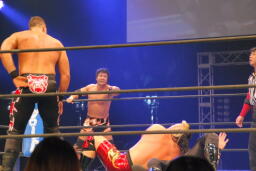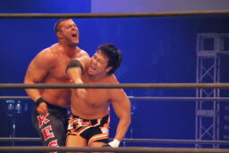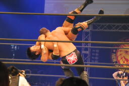 天山タッチに行こうとするがアーチャー阻止してラリアット、カウント2。スミスにタッチ。スミスストンピング、ブレーンバスター、天山ブロックして逆に投げる(左写真)。天山またタッチに行こうとするがアーチャーが阻止。