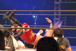 天山コーナーに上ってムーンサルトプレス(右写真)、カウント3。