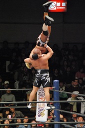 真壁エルボー、ロープに飛ぶ、石井もパワースラムお返し(左写真)。バズ・ソイヤー式だな。
