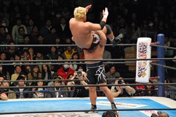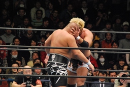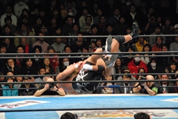 コーナーパンチ連打からフロントスープレックスホールド(左写真)、カウント2。