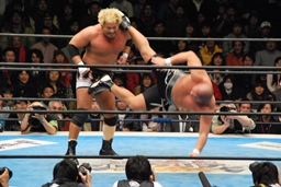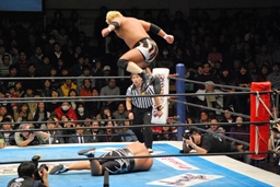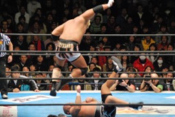 コーナーに上ってダイビングニードロップ(左写真)でカウント3。