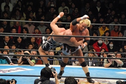 真壁2発目をかわして肩に担ぐとデスバレーボム(左写真)。