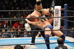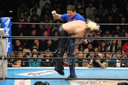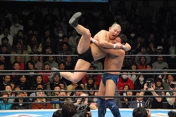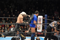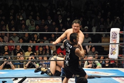 1.4で対戦する鈴木が乱入、永田はバックドロップホールド狙う、鈴木ブロック(左写真)。