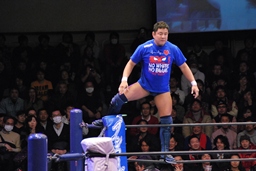 永田カウント18で戻る、タイチはコーナーに振ってジャンピングハイキック(左写真)。