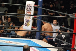 リングに戻ってアピール(右写真)、会場からは大ブーイング&「タイチは帰れ」コール。