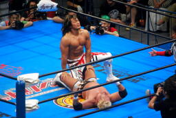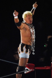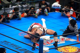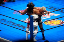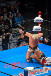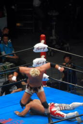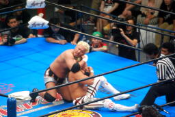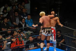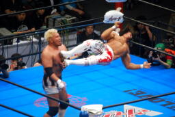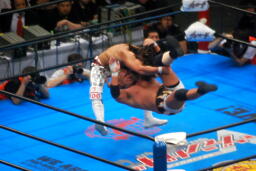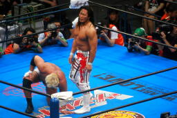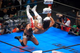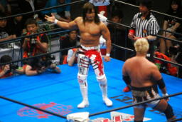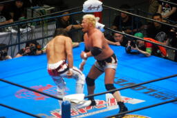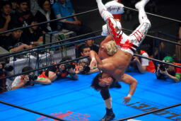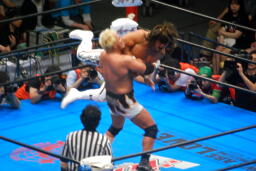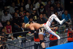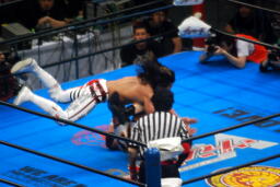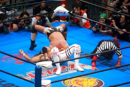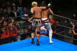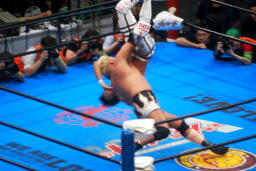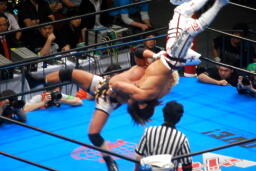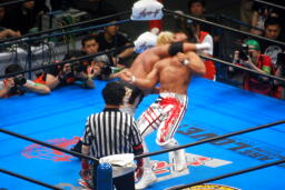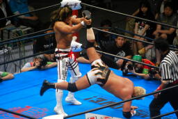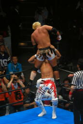 棚橋ドラゴン狙う、真壁ブロック、棚橋はだるまジャーマンにスイッチ(右写真)、カウント2。