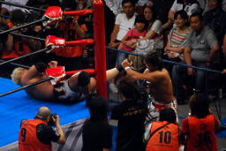 ロープで首を攻め、ブレーンバスターに(右写真)。10分経過。