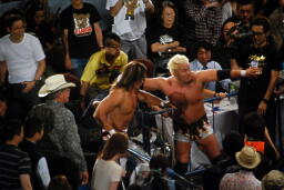 ハンセンの間近で乱闘、真壁は棚橋を鉄柱にぶつける(左写真)。