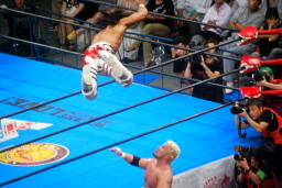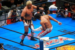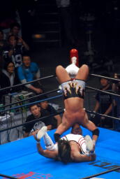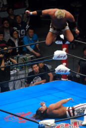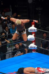 真壁ヘッドロック、棚橋ロープに振る、真壁ショルダーブロック。真壁ロープに飛ぶ、棚橋ドロップキック(右写真)、真壁すぐにショルダーブロック、棚橋場外エスケープ。