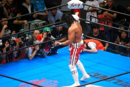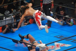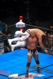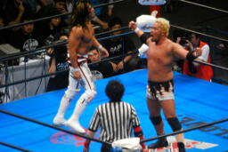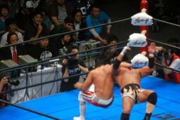 真壁がブロックすると棚橋はだるまジャーマンにスイッチするが真壁はこれもブロック、後頭部でヘッドバット(右写真)。
