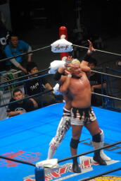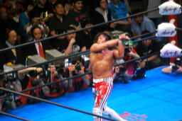 棚橋コーナーに上る、真壁はケサ斬りチョップ(左写真)。