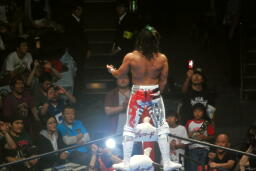 コーナーに上ってハイフライフロー、真壁の背中にヒット(右写真)。
