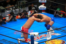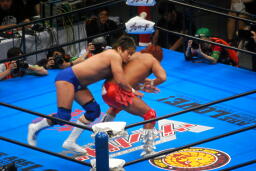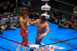 先発は内藤と真田。ロックアップ(左写真)、真田がロープに押し込む、クリーンブレーク。しかし内藤が張り手、真田も張り手打ち返す。