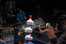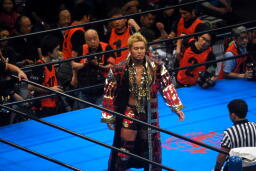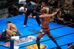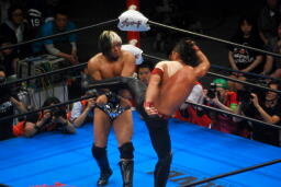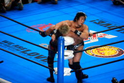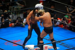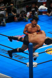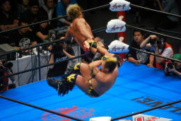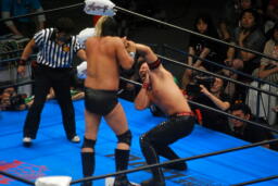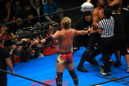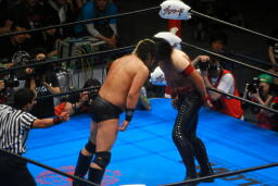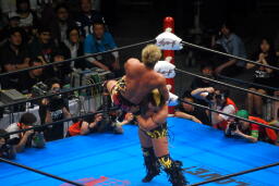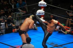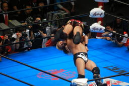 諏訪魔がオカダを場外に出す。オカダ客席に振る、諏訪魔ブロックしてエルボー(右写真)。5分経過。