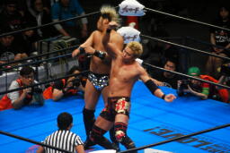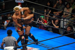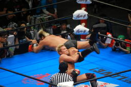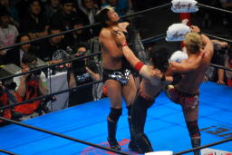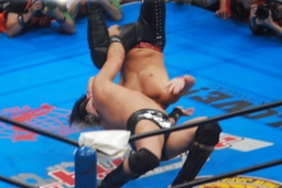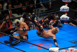 諏訪魔ロープに飛ぶ、オカダ足を抱えてフラップジャック(右写真)、中邑にタッチ。