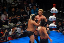 中邑ヒザ蹴り(左写真)。諏訪魔がコーナーのオカダに手を出しオカダタッチ要求、中邑応じる。