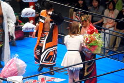 「ラジオ新日本プロレス」の赤井沙希から武藤・天コジに花束贈呈(左写真)。