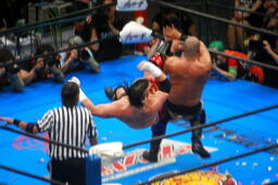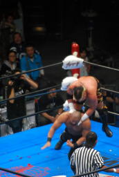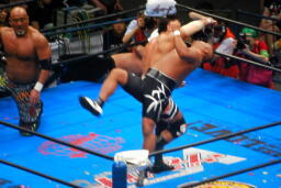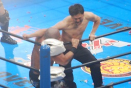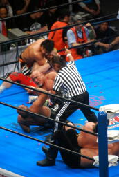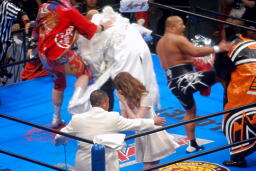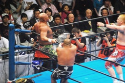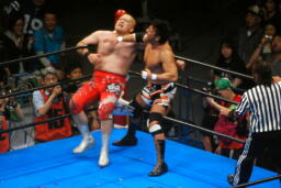 矢野が武藤にモンゴリアンチョップ(左写真)、ロープに振ってラリアット、武藤前転でかわしてドロップキック、小島にタッチ。