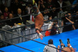 小島「行っちゃうぞバカヤロー!」からコーナーに上る、飯塚が足を押さえるが天山がヘルプ、ダイビングエルボードロップに(左写真)。