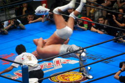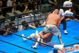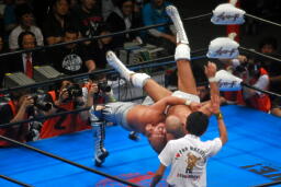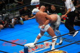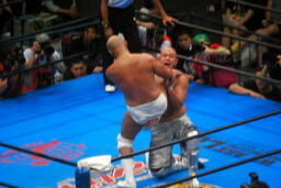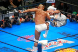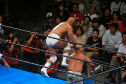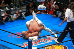 ケアはタイガードライバー狙うが持ち上げる前にグリップが外れ横に落としてしまう(右写真)。こないだの大森戦もひどかったが、ここまで来ると三沢に対し失礼なレベル。それでもカバー、カウント2。